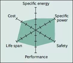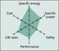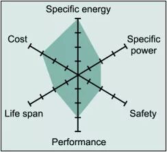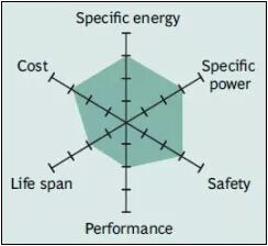 六角蜘蛛图(图2)总结了与运行相关的具体能量或容量方面的钴酸锂性能;具体功率或提供大电流的能力; 安全; 在高低温环境下的性能表现; 寿命包括日历寿命和循环寿命; 成本特性。蜘蛛图中没有显示的其他重要特征还包括毒性,快速充电能力,自放电和保质期。