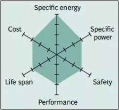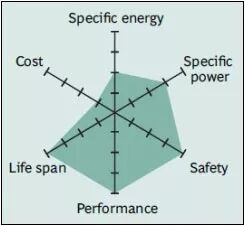 镍钴铝酸锂电池或NCA自1999年以后被应用。它具有较高的比能量,相当好的比功率和长的使用寿命与NMC有相似之处。不太讨人喜欢的是安全性和成本。图11总结了六个关键特征。NCA是锂镍氧化物的进一步发展;加入铝赋予电池更好的化学稳定性。